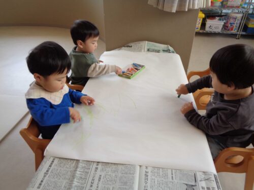 最初にクレヨンを使ってお絵描きをしました。