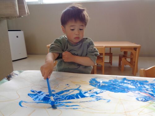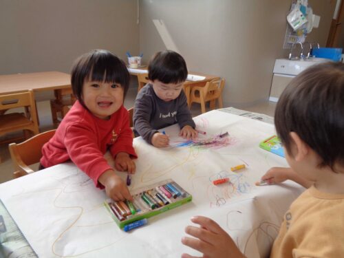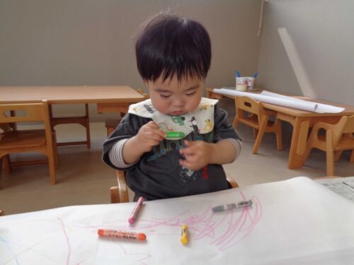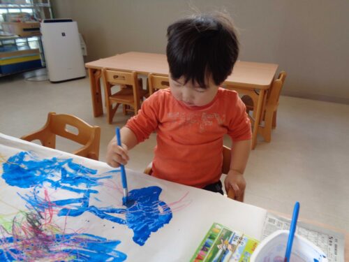 初めてクレヨンや絵具を使った活動に挑戦するこどももいましたが、