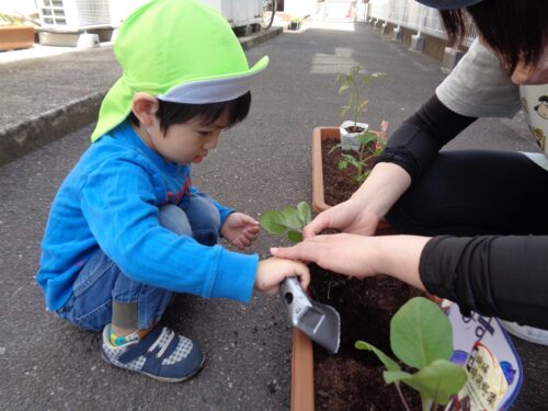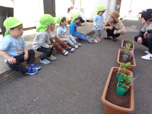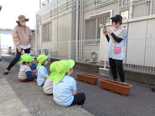 保育士が苗の説明を行うと、”何のお野菜なのかな?””どうやって植えるのかな?”と