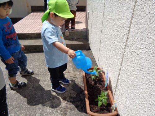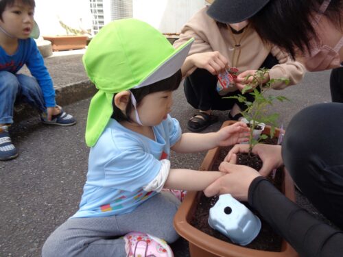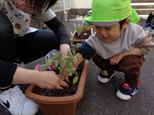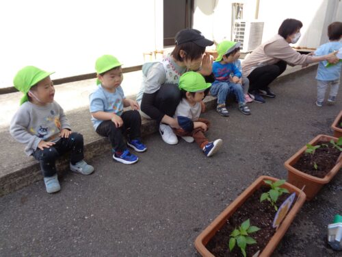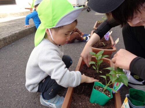 今日は、あめ組のこども達がピーマンとトマトとなすの苗植えを行いました😊