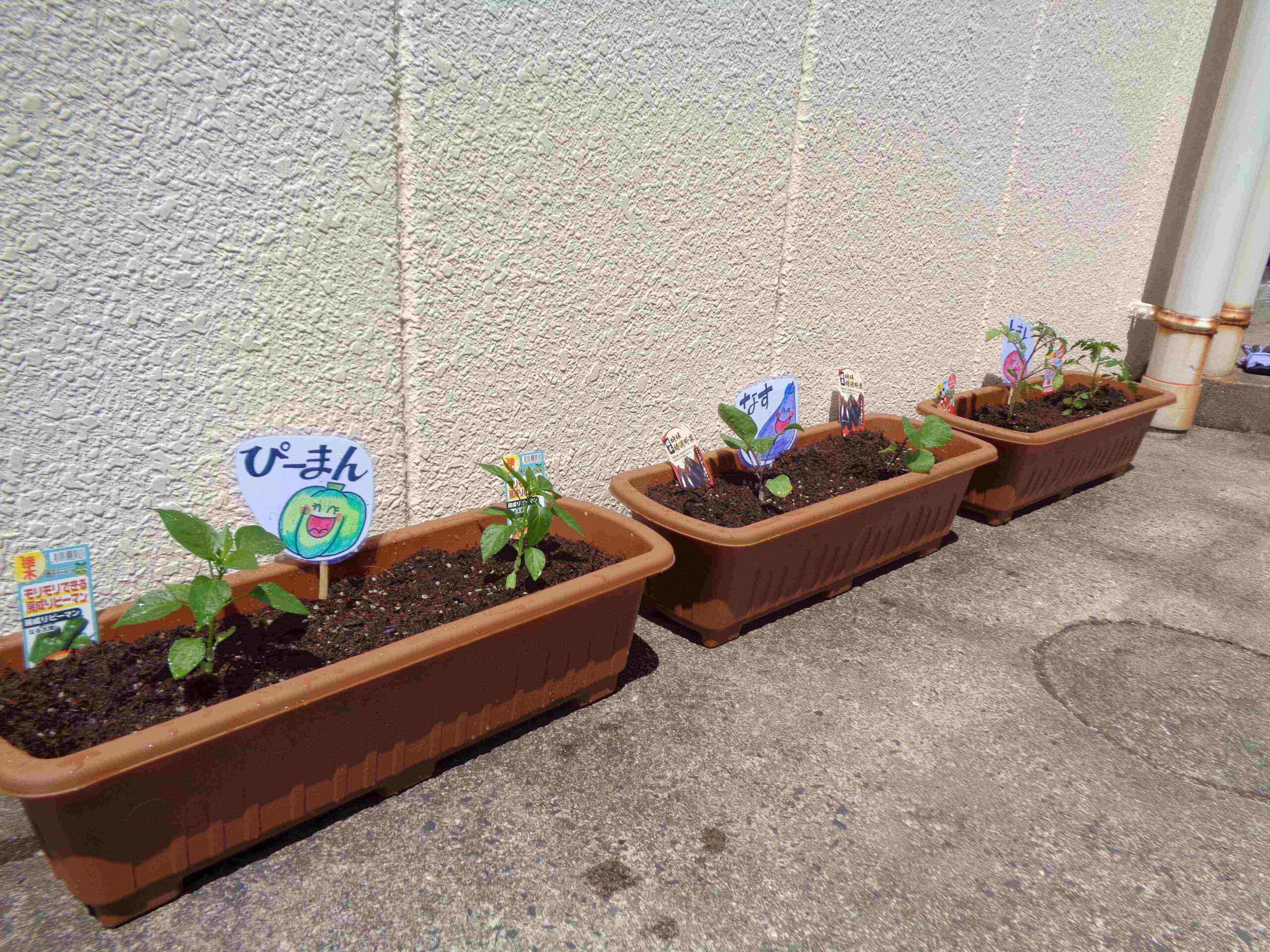 みんなで植えたお野菜のプランターは、登園通路に並べていますので、