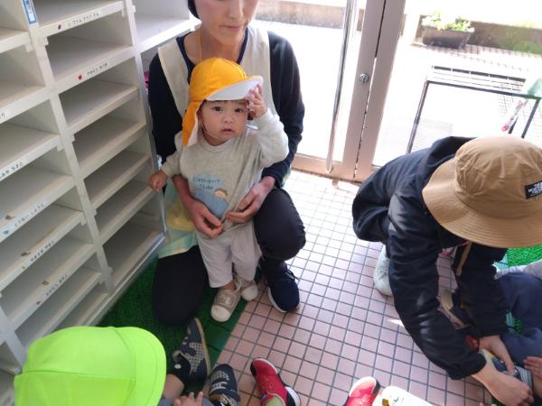 こども達はお散歩に行くことが分かると嬉しそうに靴を履こうとしていました!