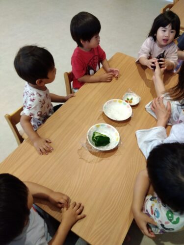 食育活動では五感を使いながら、成長に必要な 野菜等の食べ物や 食べる事に