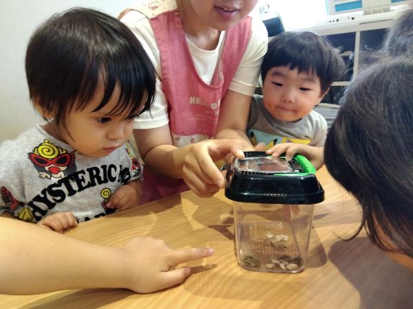 保育園で初めてみる、かえるを最後まで夢中に観察していたこども達。