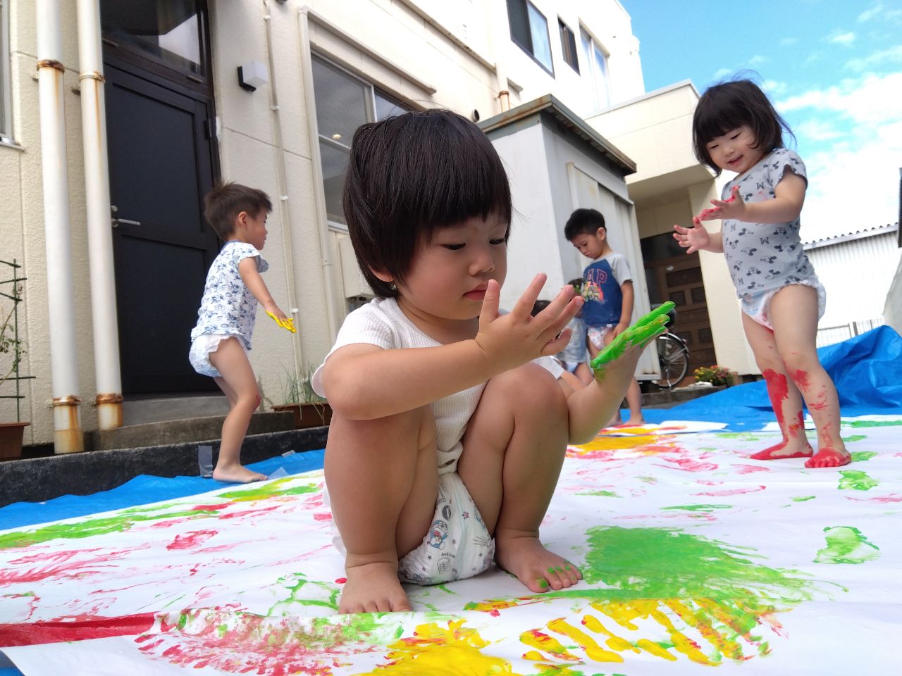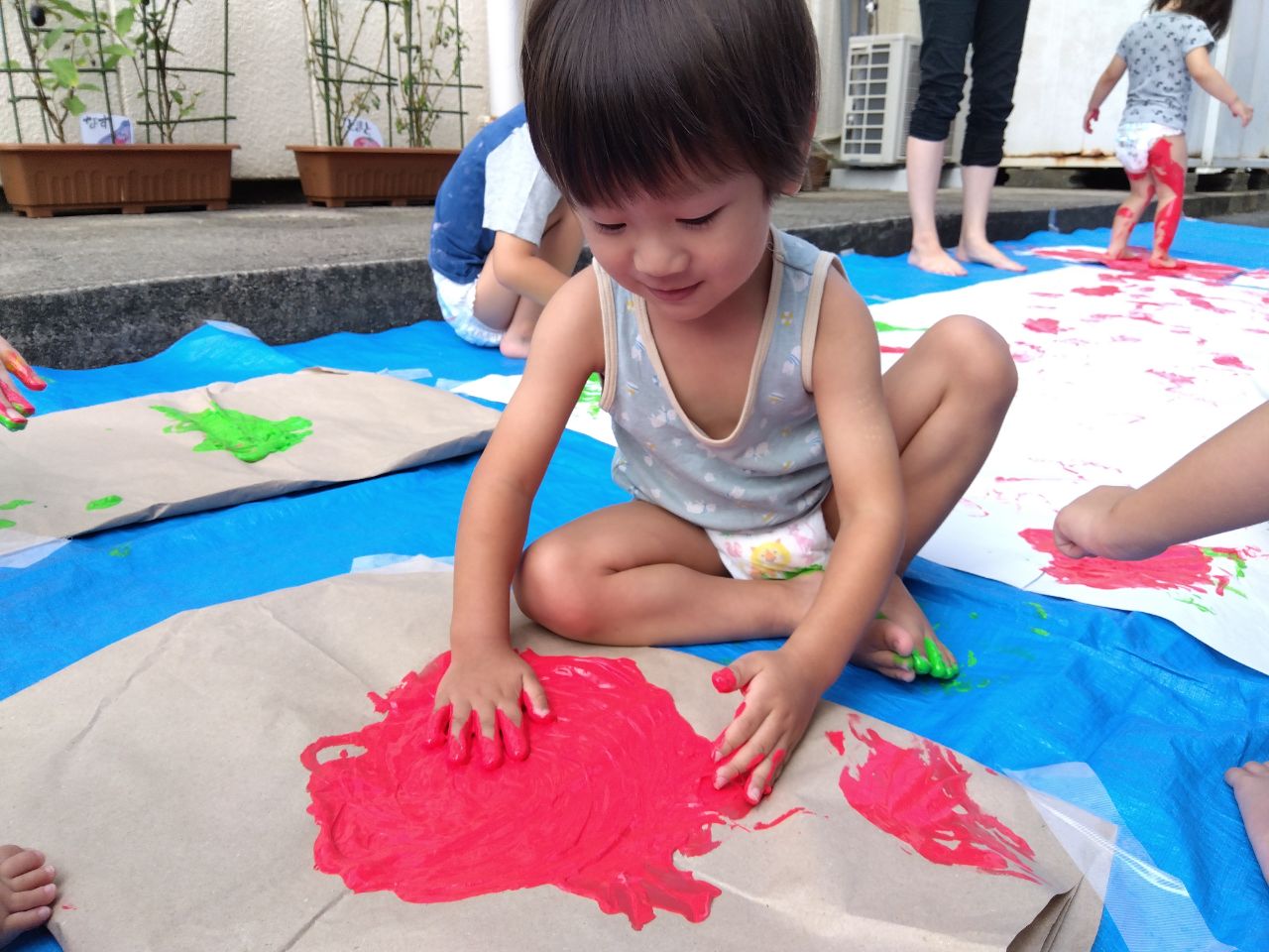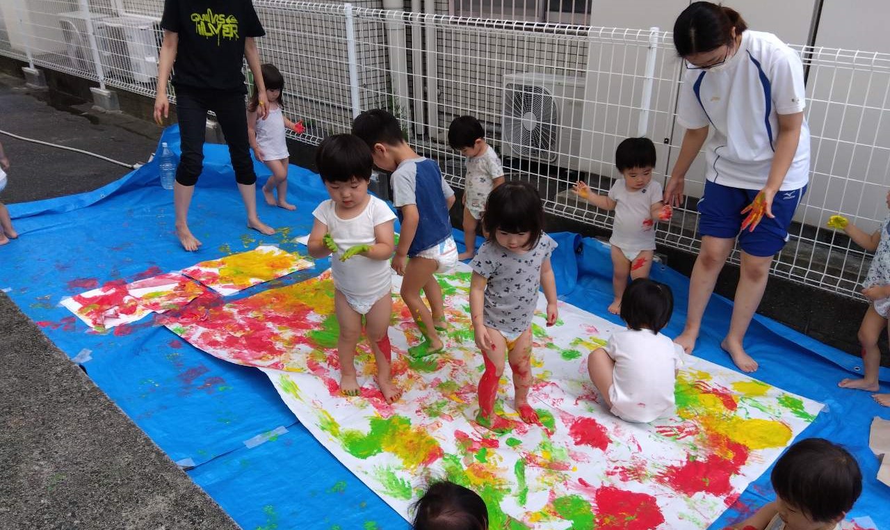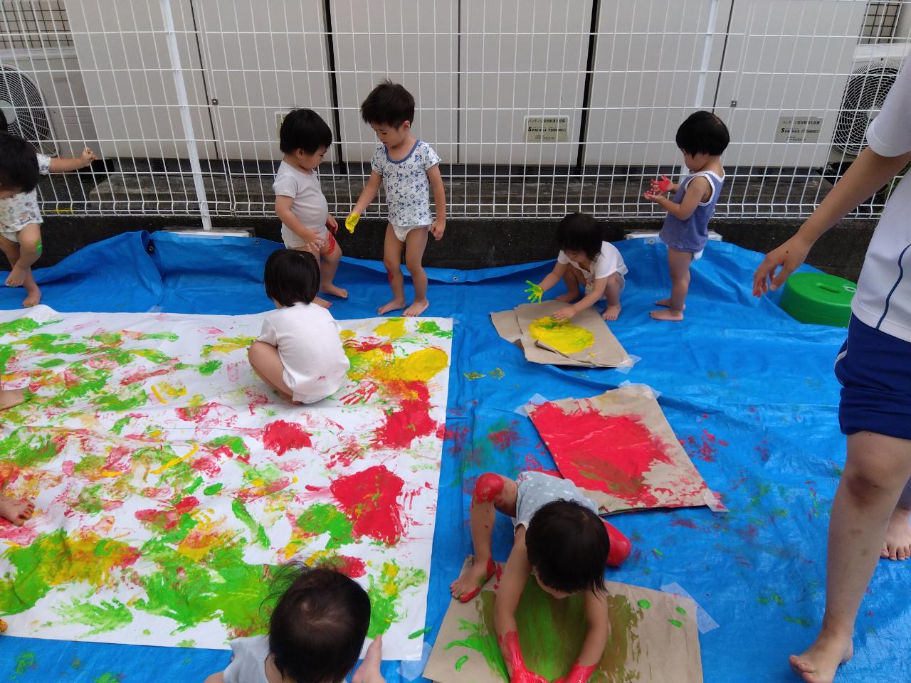大きく真っ白な紙と、赤・黄・緑の絵の具に、こども達も待ちきれない様子😊