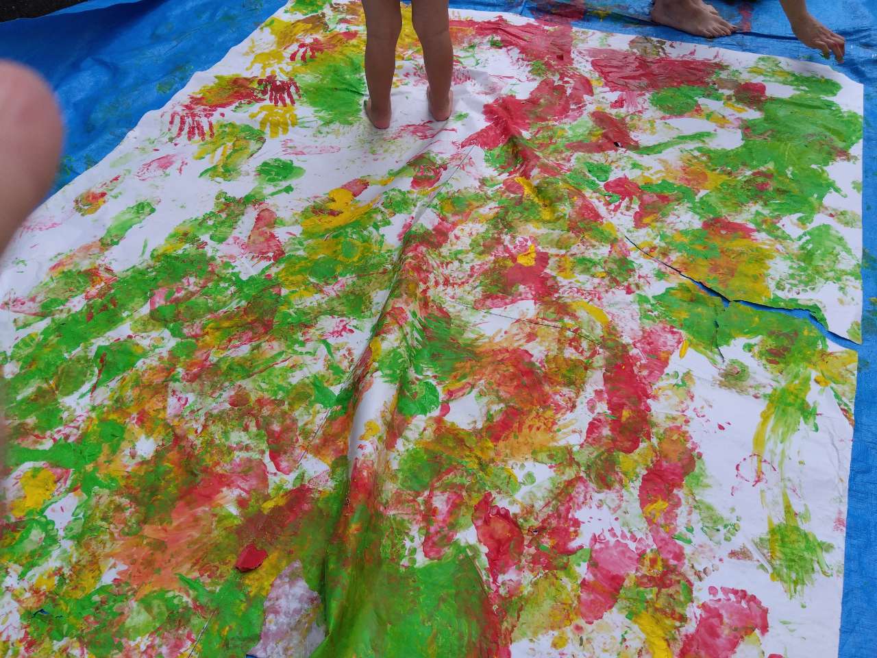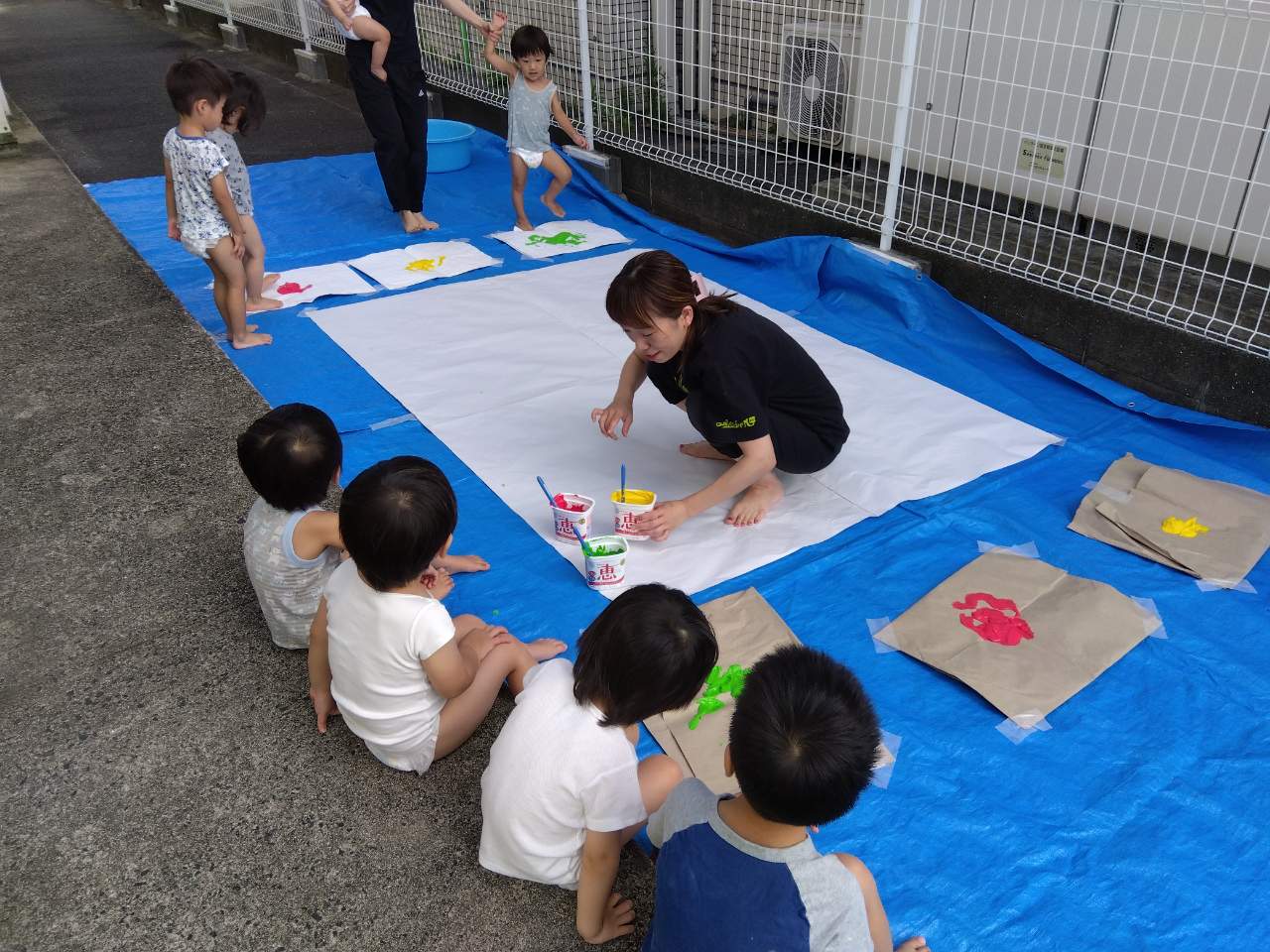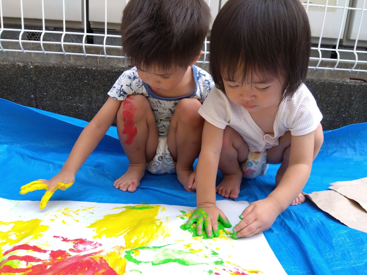 大きく真っ白な紙と、赤・黄・緑の絵の具に、こども達も待ちきれない様子😊