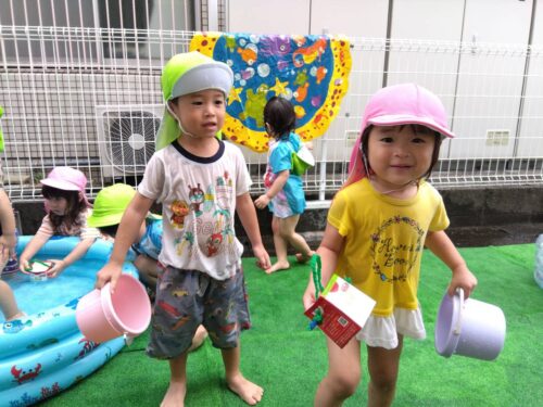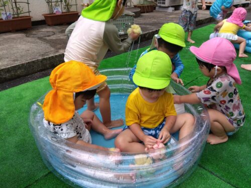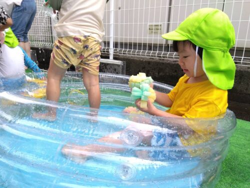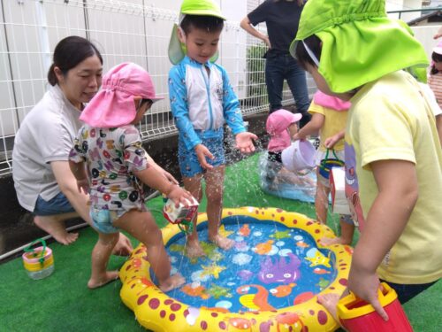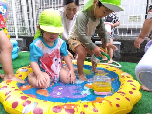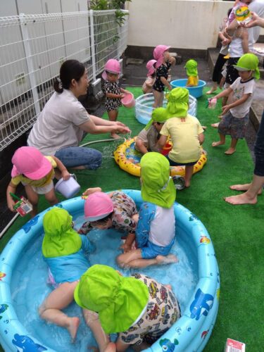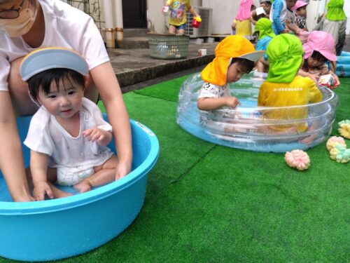 0歳児のお友だちは水遊びに慣れなくて泣いてしまったり、やっと水の中に入ることが出来たり・・・また来年の夏は成長してどんな姿を見せてくれるでしょう。