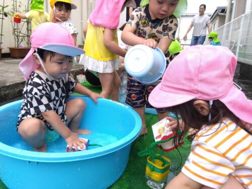 水遊び用の保育士手作りのおもちゃを上手に使って遊びました!