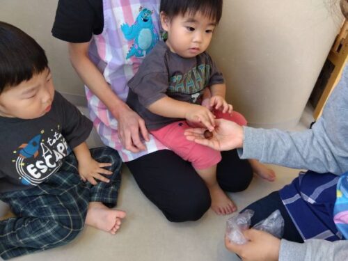 お友だちがお休みに遊びに行って、どんぐりを見つけて保育園に持ってきてくれました。とってもうれしそうに見せてくれました。みんなで見たり触ったり・・・Kくんありがとう✨