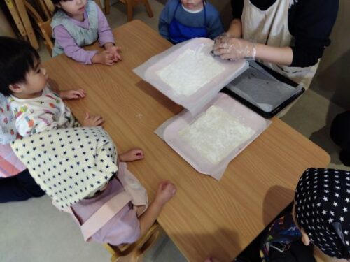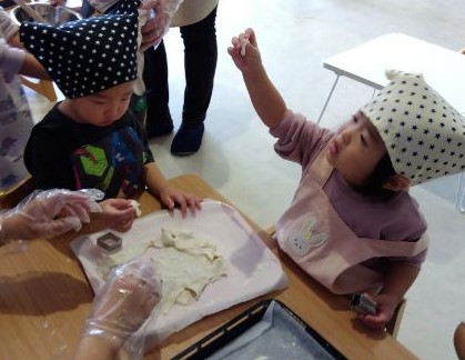 あめ組(2歳児)と だいち組(1歳児)でパイ生地の型抜きや カボチャをすりつぶすことをしました。