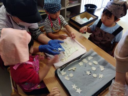 あめ組(2歳児)のお友だちは、いろいろな型を使って可愛らしい形がたくさんできていました✨