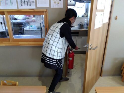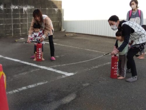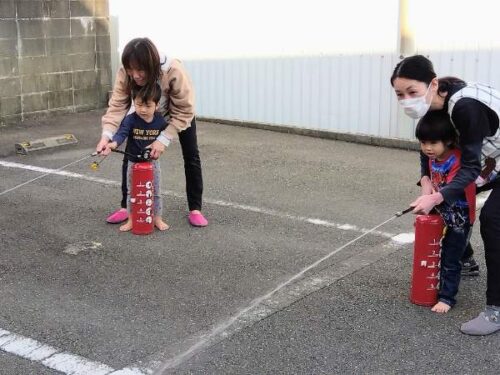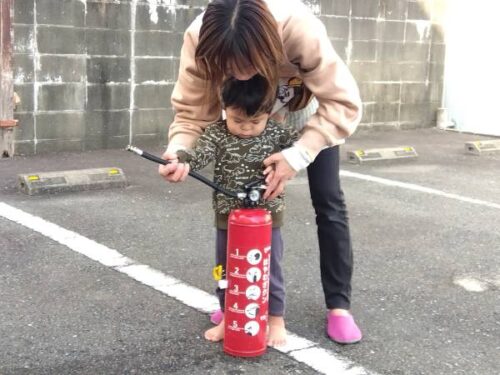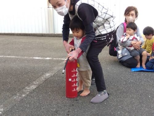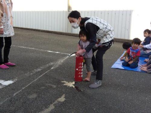 こども達も保育士と一緒に消火訓練をしてみました。