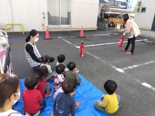 保育士が消火器の使い方の話をしながら消火してみせると、興味津々のこども達。