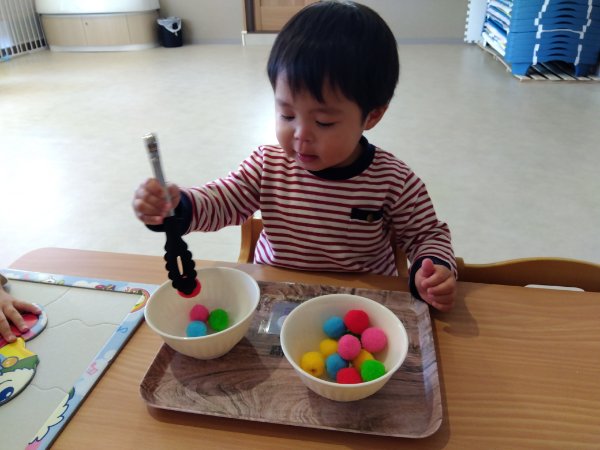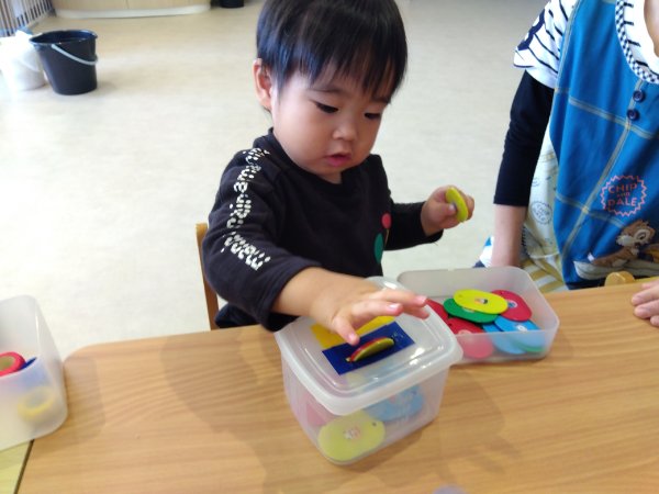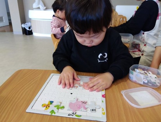 今回は、机上遊びを楽しむだいち組(1歳児)の様子を紹介します。