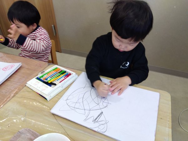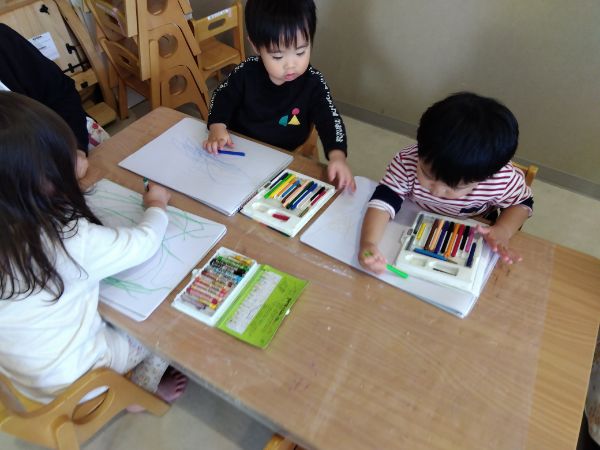 次は、「お絵かきする~!」と言って、自由画帳とクーピーやクレヨンを取り出してきたこども達🖍️