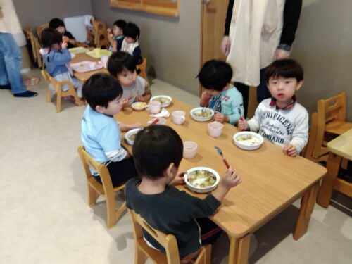 「美味しいね」と今日の給食をパクパク食べているその時!