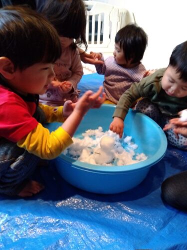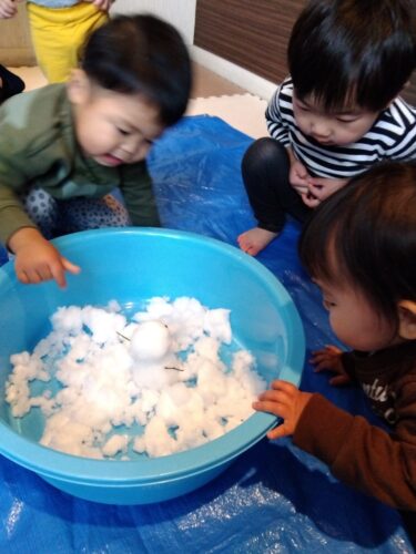 冷たい雪に目を丸くして驚くお友だちも😊