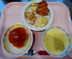 『ロールパン コーンスープ ローストチキン もみの木ハンバーグ