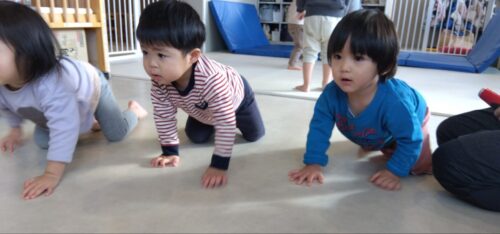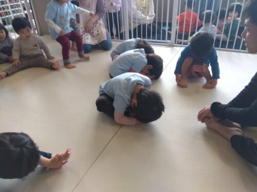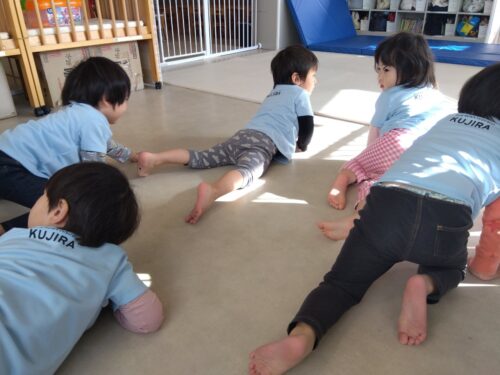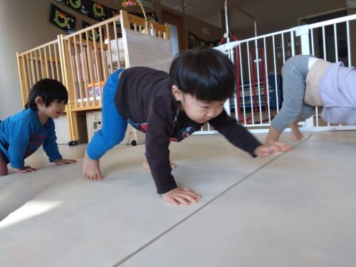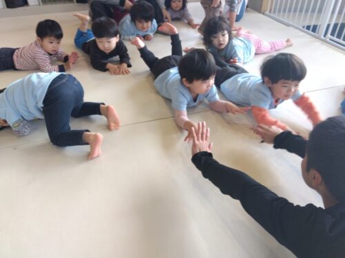 次は動物に変身!お腹をつけたり、お尻をあげて進めるかな?