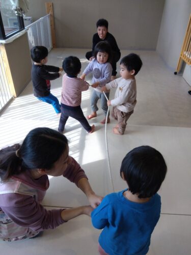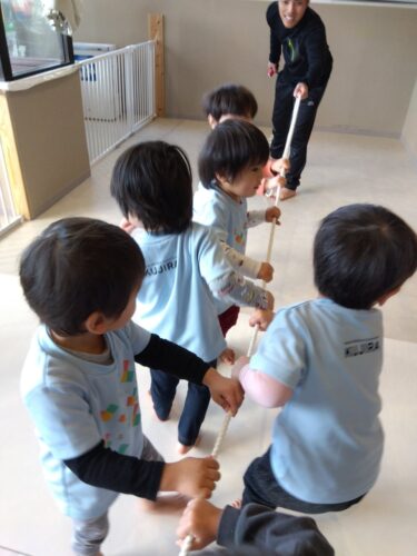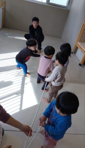 次は、あめ組、だいち組に分かれてロープを引っ張りあいっこ♪