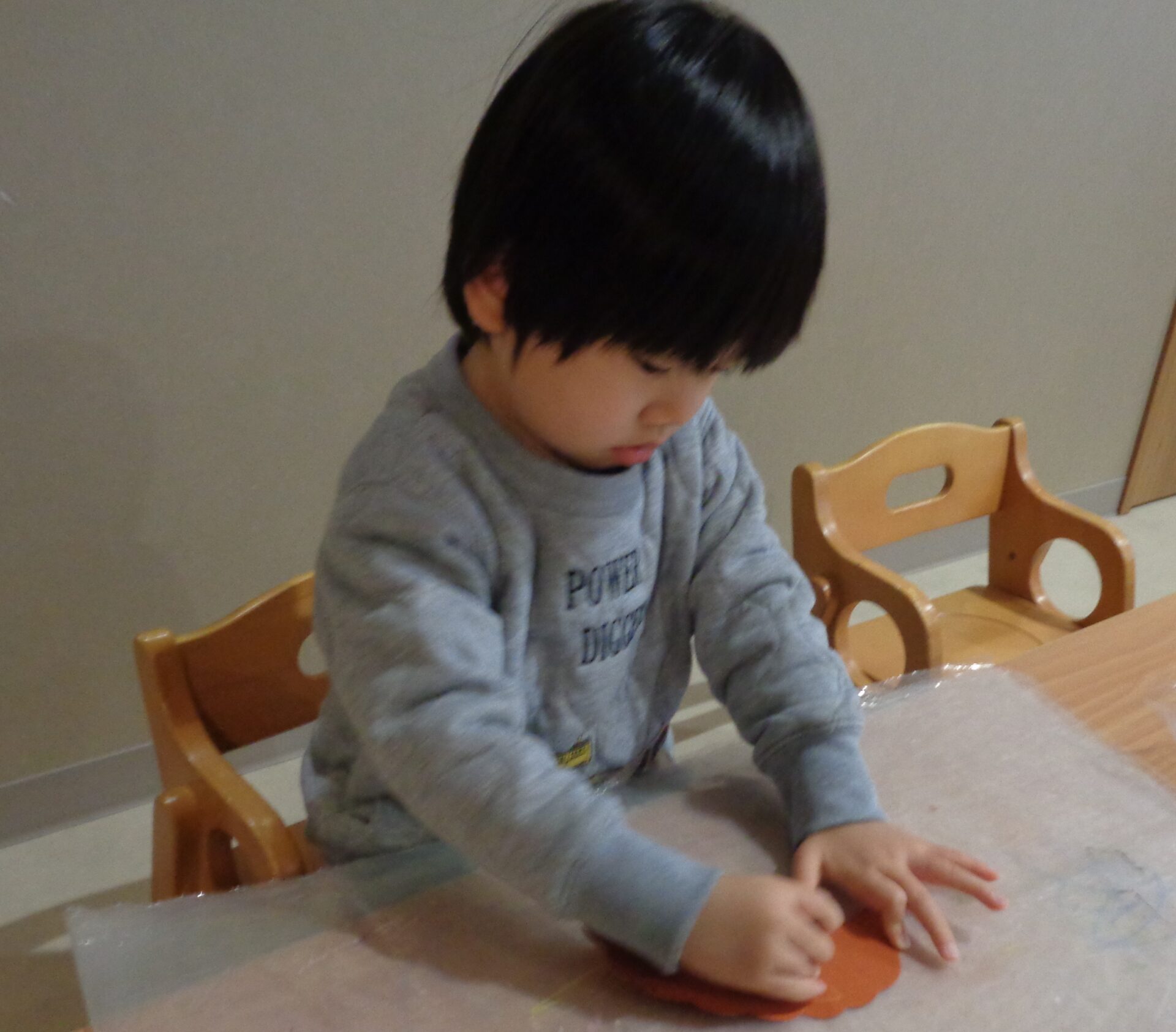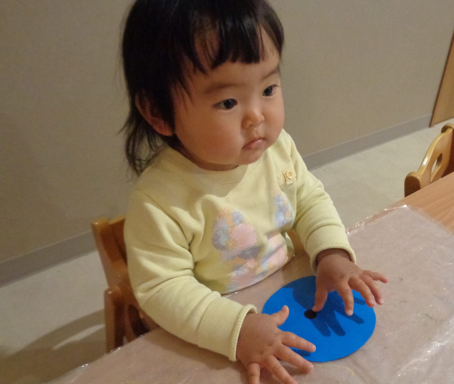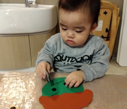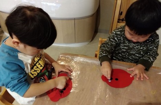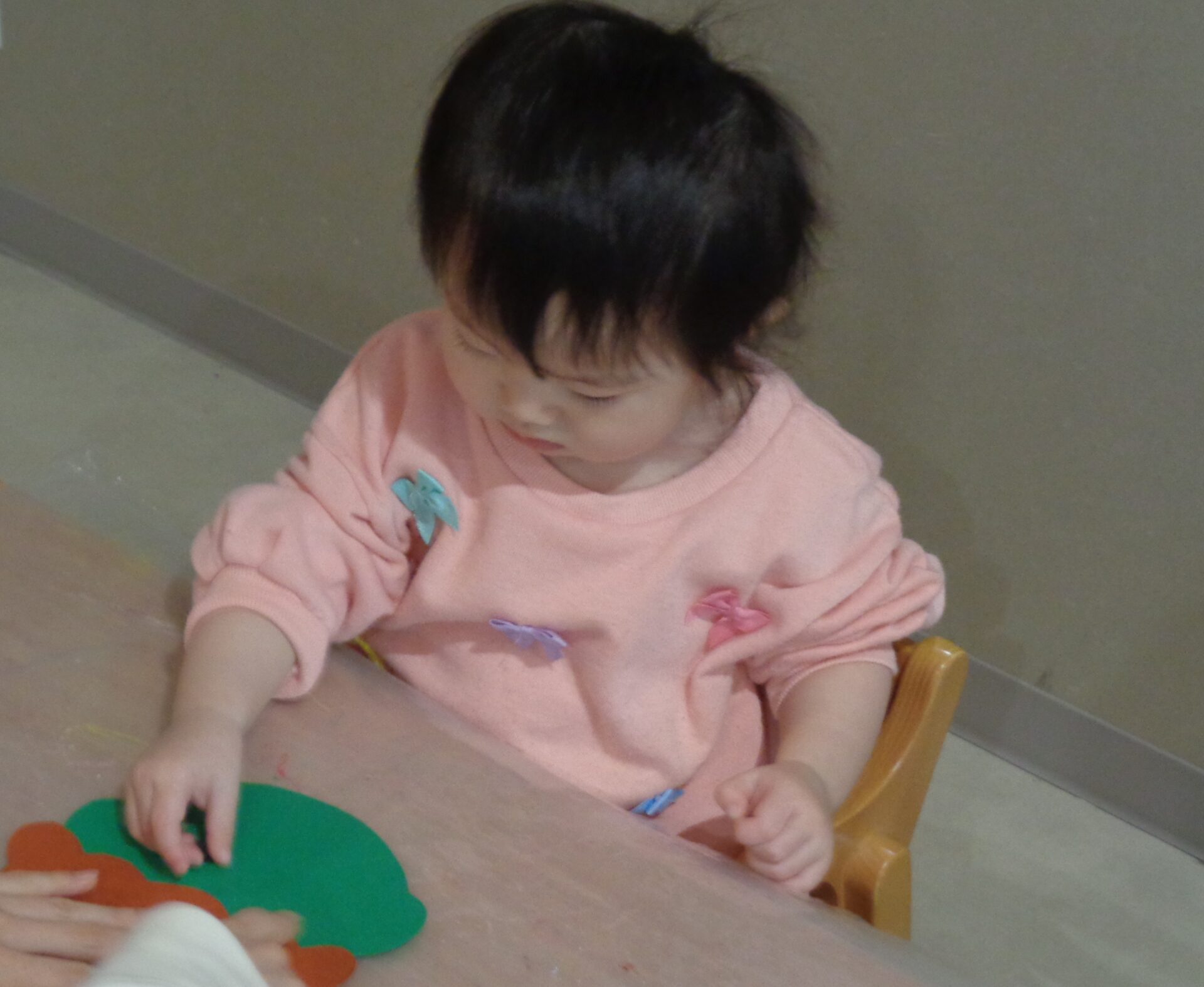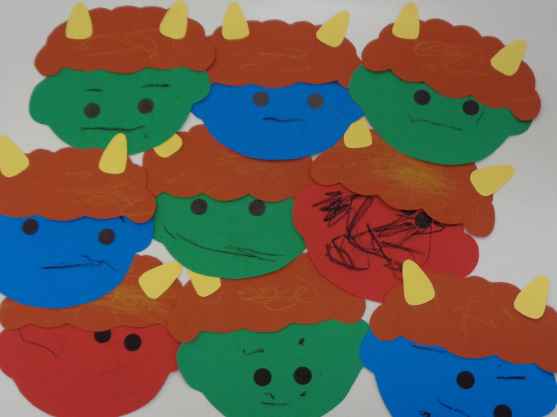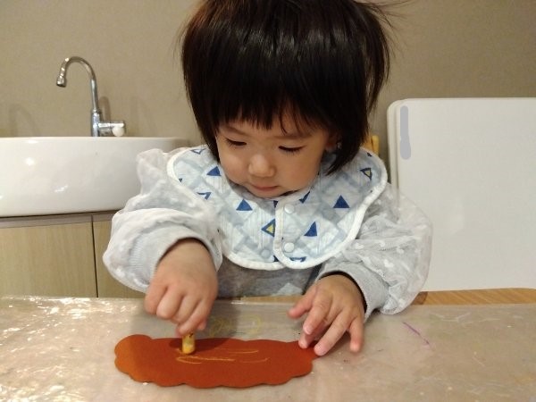 クレヨンを持って、鬼さんの眉と口も描きましたよ。