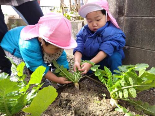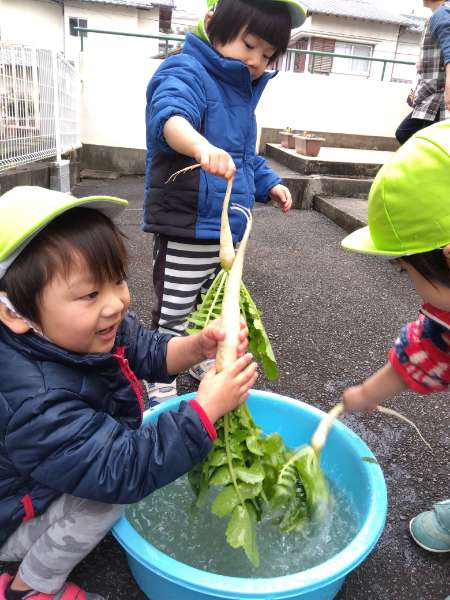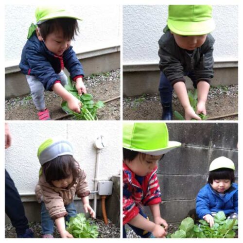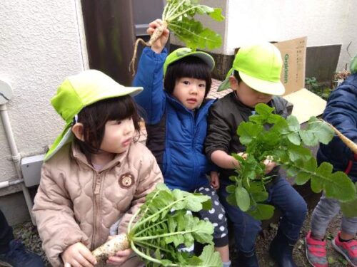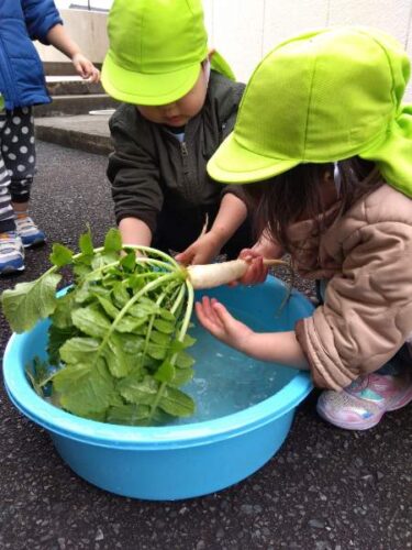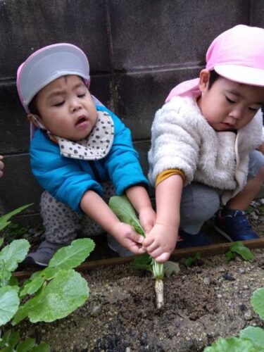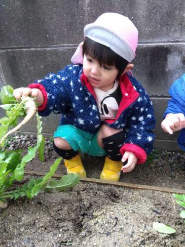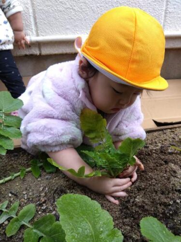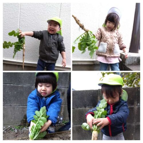 今年は昨年に比べて小ぶりの大根でしたが、0~2歳児のこども達が自分で頑張って抜こうとするには ちょうどいい大きさだったようです。いい経験が出来たこども達。自分で大根をとったことに満足気でした✨