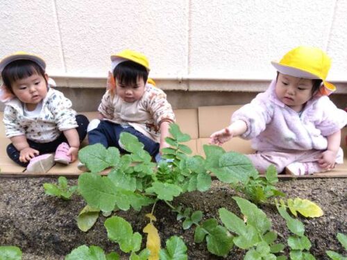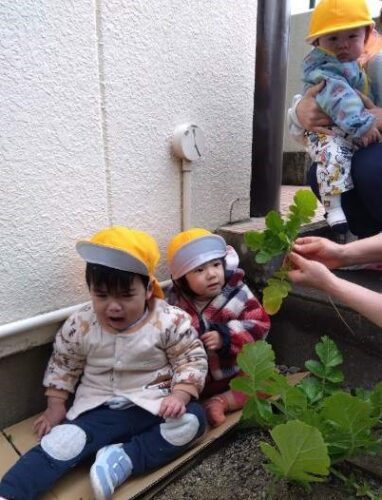 うみ組(0歳児)のこども達も、だいこん畑行ってみました。