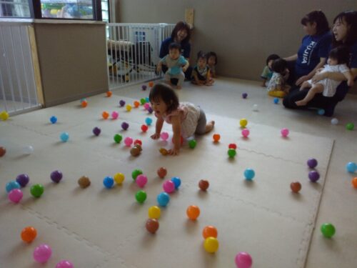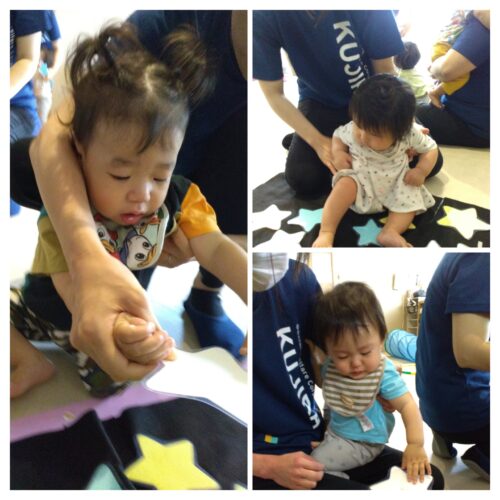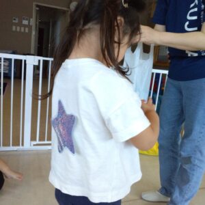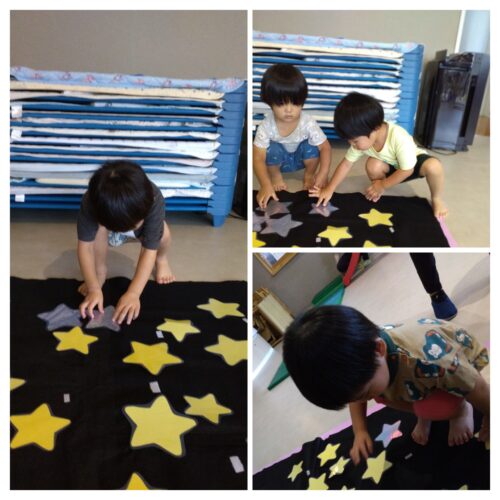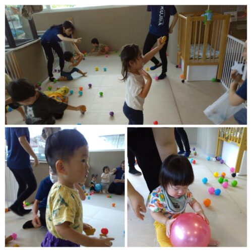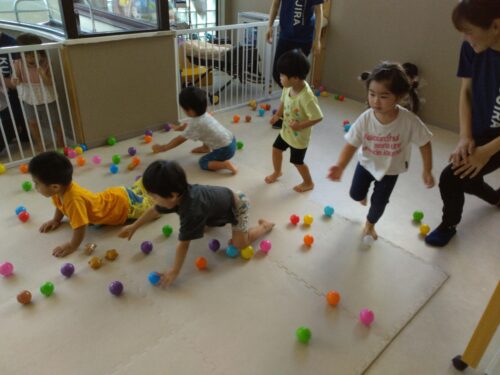 たくさんあるボールの中から☆星型☆のボールを見つけたら背中にキラキラ星を貼ってもらいます。