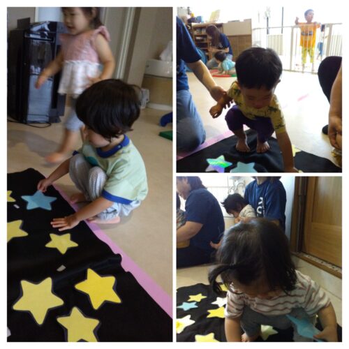 背中に貼られた星をはがしてもらい、夜空に見立てた幕に星を貼っていきます☆彡