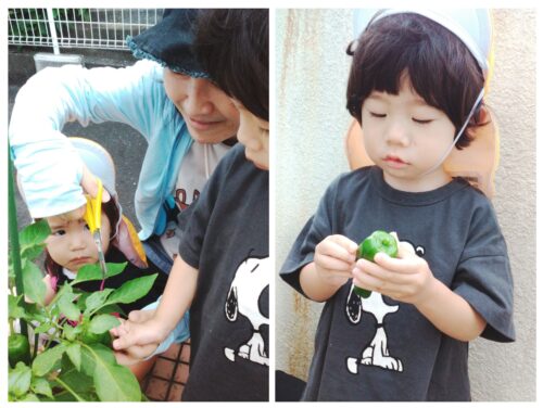 だいち組、保育園で育てたピーマンを収穫しましたよ。