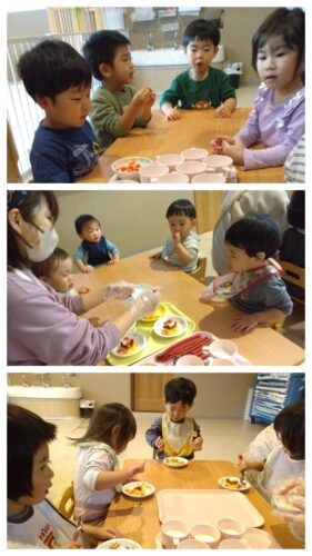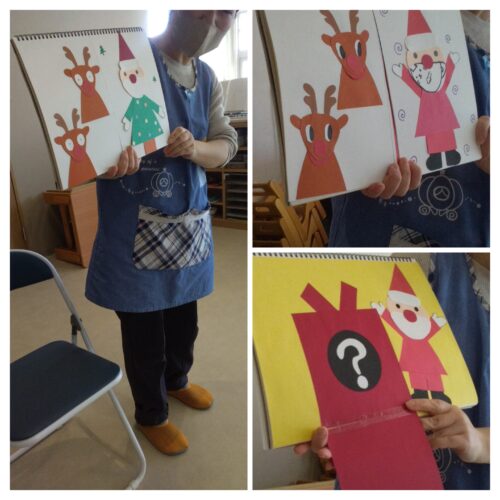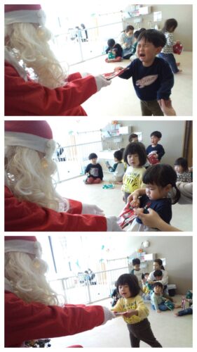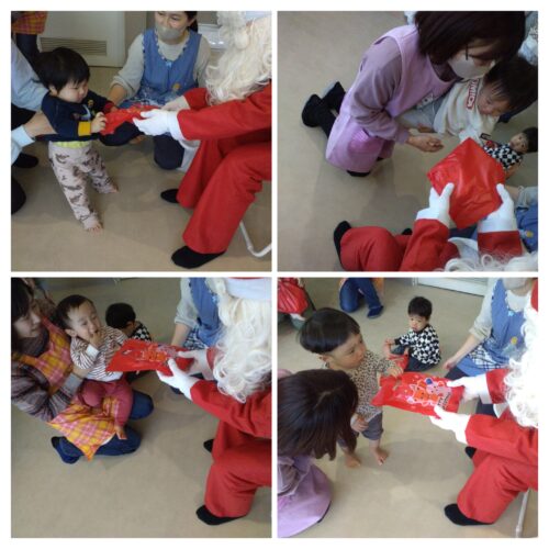12月に入ってからクリスマスの歌を歌ったり、あめ組(2歳児)はサンタさんに何をもらいたいのかの話題がたくさん出ていました♬