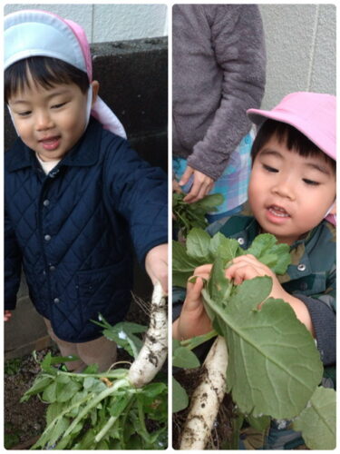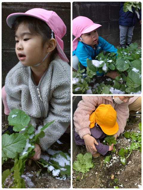 雪のちらつく中、11月に植えた大根掘りを行いました。
