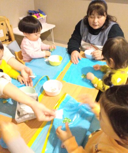 だいち組(1歳児)とうみ組(0歳児)は折り紙のシールを剥がしてペタリ。