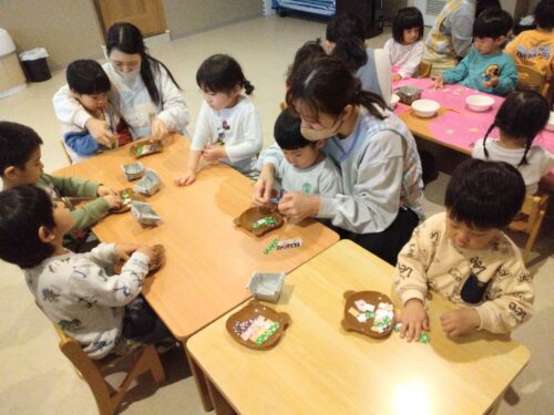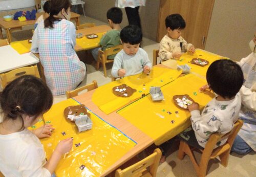 「こう?」「貼れたよ」夢中になって制作に取り組んでいました。