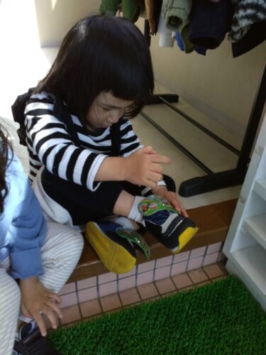 靴や靴下を履く練習を始めましたが、中には自分で上手に履けるお友だちもいるんですよ。