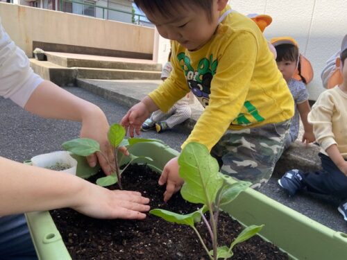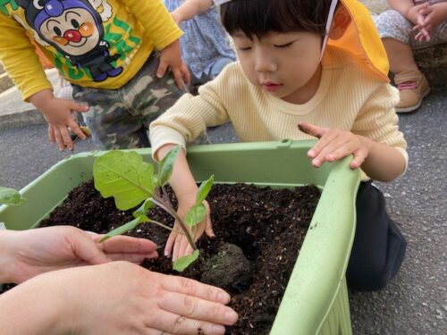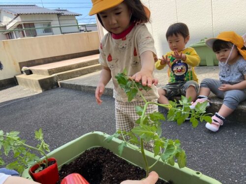 保育園に帰ったら、早速 トマト・ピーマン・なすの苗を植えました。