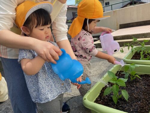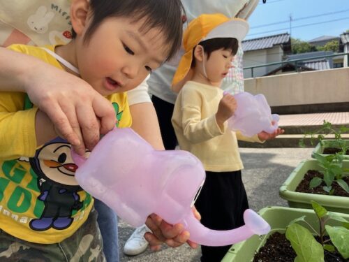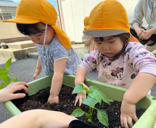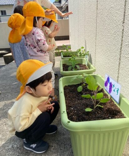 あめ組(2歳児)で夏野菜(トマト・ピーマン・なす)をつくってみよう!