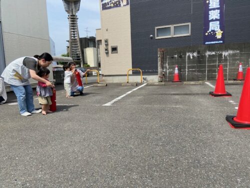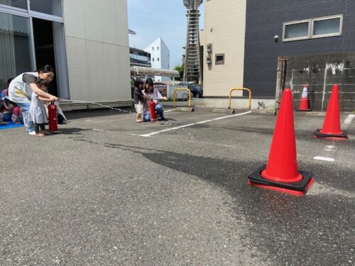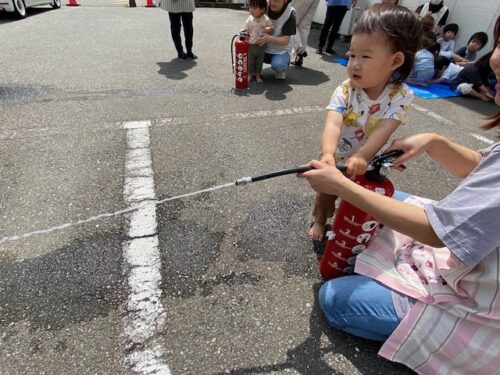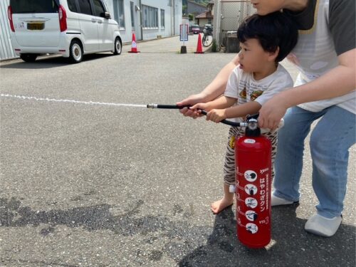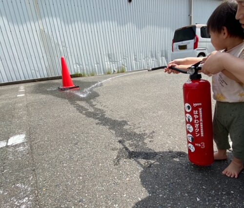 そして今回は、訓練用に水が入った消火器を消防署から借り、実際に子どもたちと一緒に消火体験をしてみました。