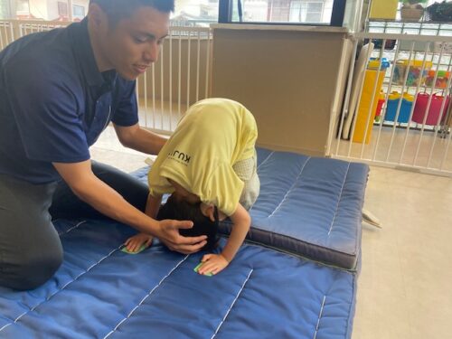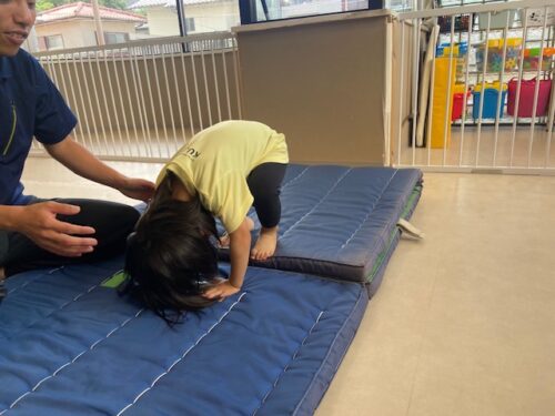 テープに両手をついて頭を丸めたら、先生に補助してもらい、みんな上手にくるっ!