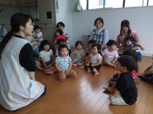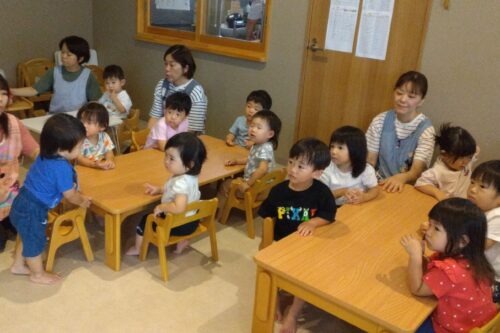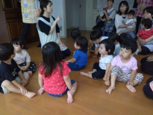 1階だけが保育園なので、子どもたちは普段2階に行くことがなく周りに興味津々でしたが、落ち着くと保育士の話に耳を傾けていました。