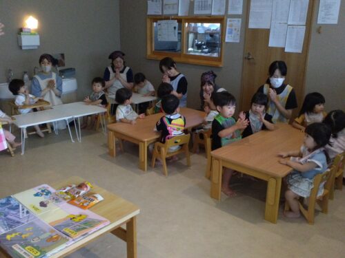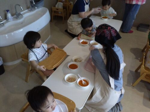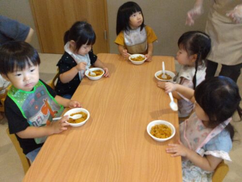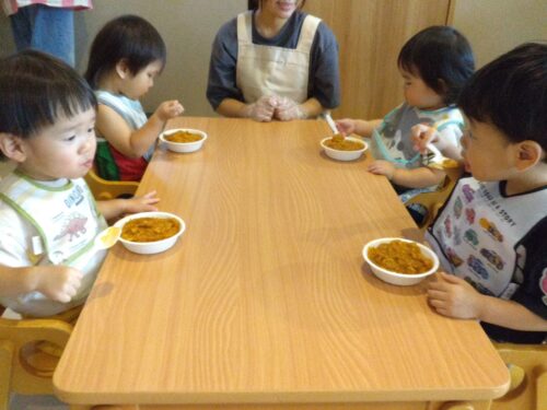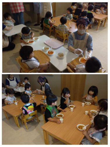 今日はうみ組(0歳児)だいち組(1歳児)あめ組(2歳児)で一斉にいただきますをして、カレーライスとゼリーを食べました。