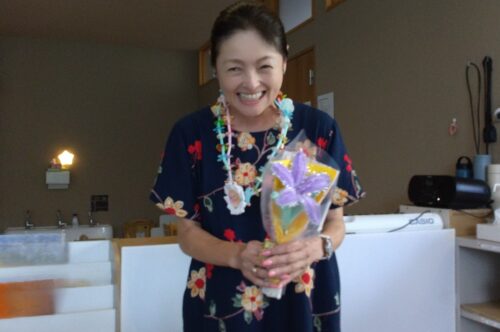 最後は、お礼に あめ組(2歳児)で作ったペンダントとお花を、玲子さんに渡しました。