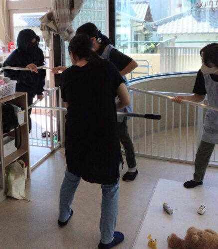 今日は【保育中に不審者が園内に入ってきたらどうするか】を想定した不審者対応訓練を行いました。