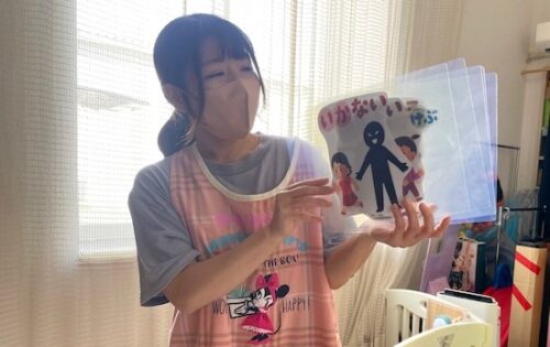 不審者を発見した保育者は合言葉で周りの保育者に知らせ、通報・子どもたちの避難・安全を守るためにすぐに行動します。