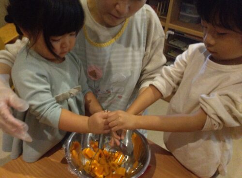 給食室で茹でてもらったかぼちゃを、友だちと交代しながらつぶしていきました。