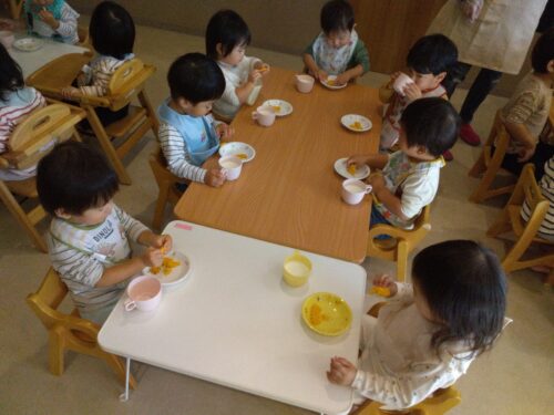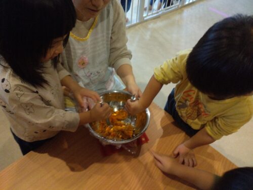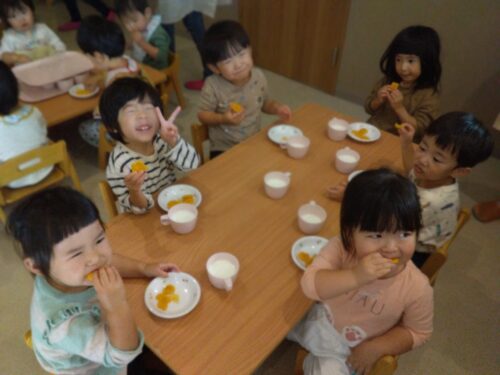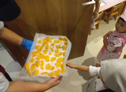 あめ組がクッキングをしたかぼちゃ味のハロウィンクッキーを、午後のおやつの時間にみんなでいただきました。