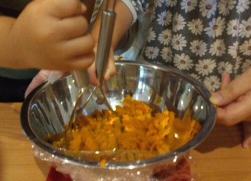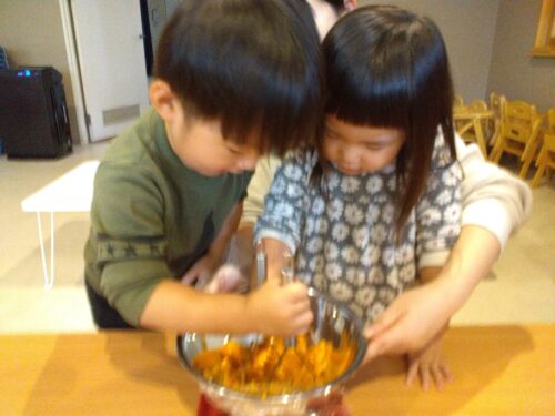 前日に子どもたちがなめらかにつぶしたかぼちゃが入っています。