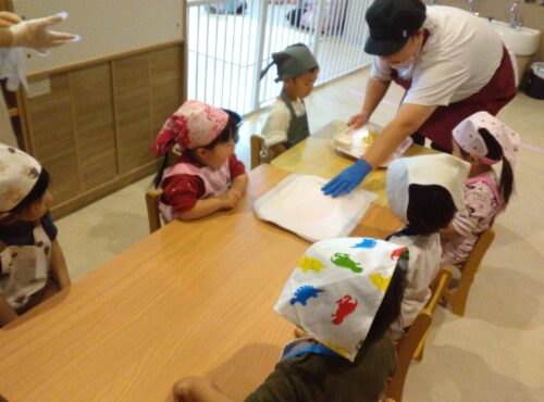 今日は、エプロンと三角巾を着けて手を洗って用意が終わると・・・