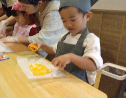 給食室から美味しそうに変身したクッキー生地がやってきました。