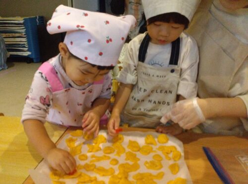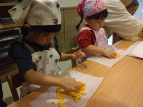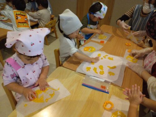 10月30日と31日の2日間、あめ組(2歳児)でかぼちゃを使ったハロウィンクッキー作りをしました。